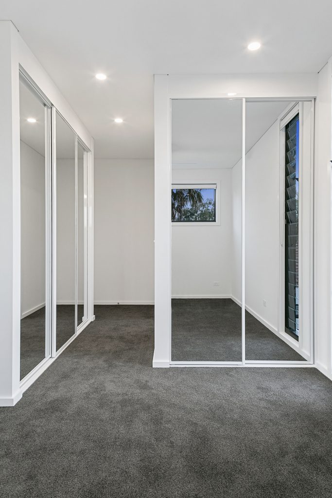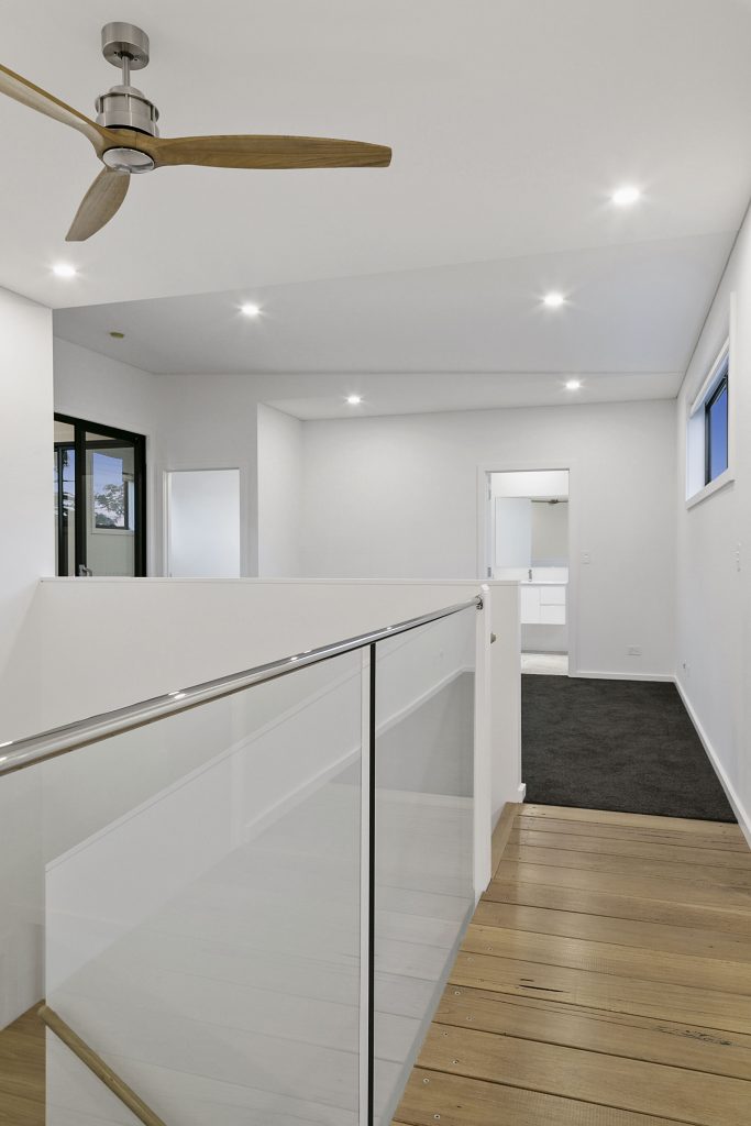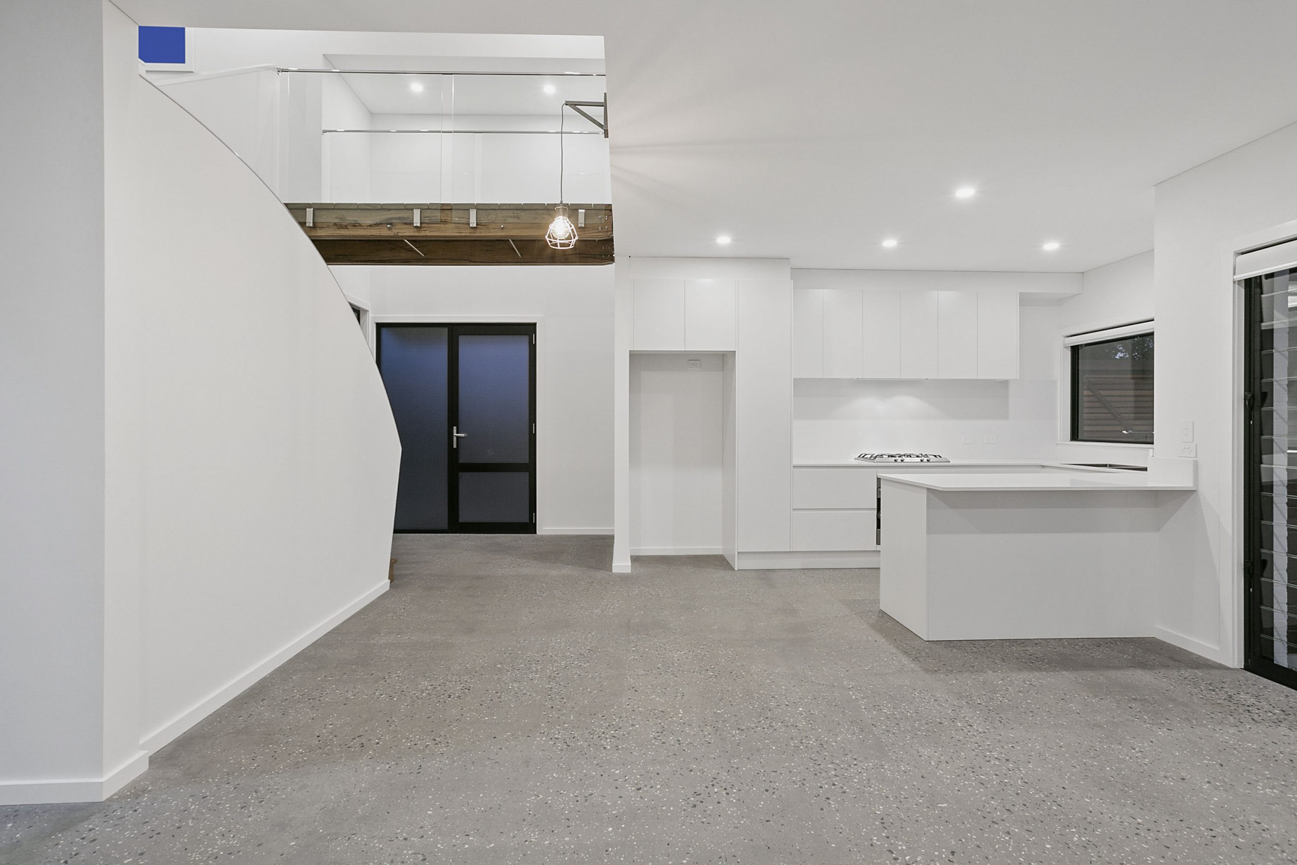 The townhouses showcase a perfect blend of modern design and functional living spaces. The polished concrete ground floor with a striking matt finish sets the tone for the contemporary aesthetic throughout. Adding to the architectural allure is a distinctive stairwell and void, which are gracefully traversed by a recycled timber and glass bridge.